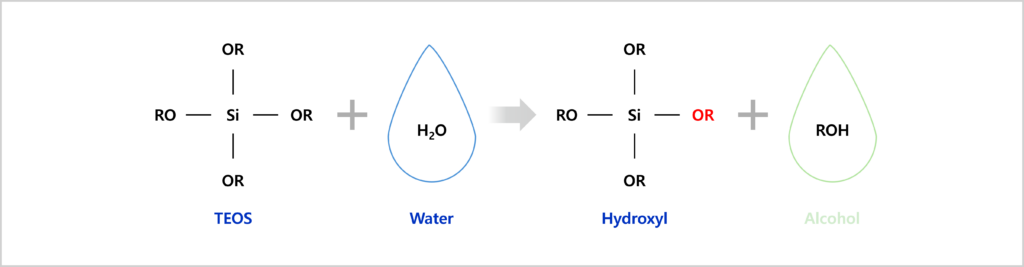 Metal alkoxides are ideal chemical precursors for sol-gel synthesis because they react readily with water. For fabrication of silica glass, the silicon alkoxides such as silicone tetraethoxides (Si(OC₂H₅)₄, tetraethyl orthosilicate, TEOS) are used. Alkoxides are hydrolyzed in the existence of water by acid- or base- catalyzed processes. The reaction is called hydrolysis, because a hydroxyl ion becomes attached to the silicon atom as follows: