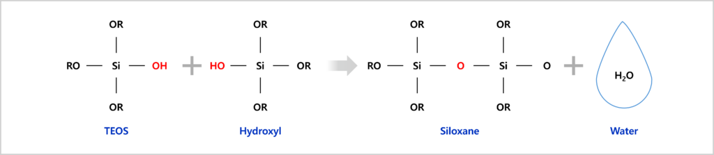 The hydrolyzed molecules can link together in a water condensation (hydroxyl-hydroxyl reaction) and an alcohol condensation (hydroxyl-alkoxy reaction) to form siloxane linkage (Si-O-Si) as follows: