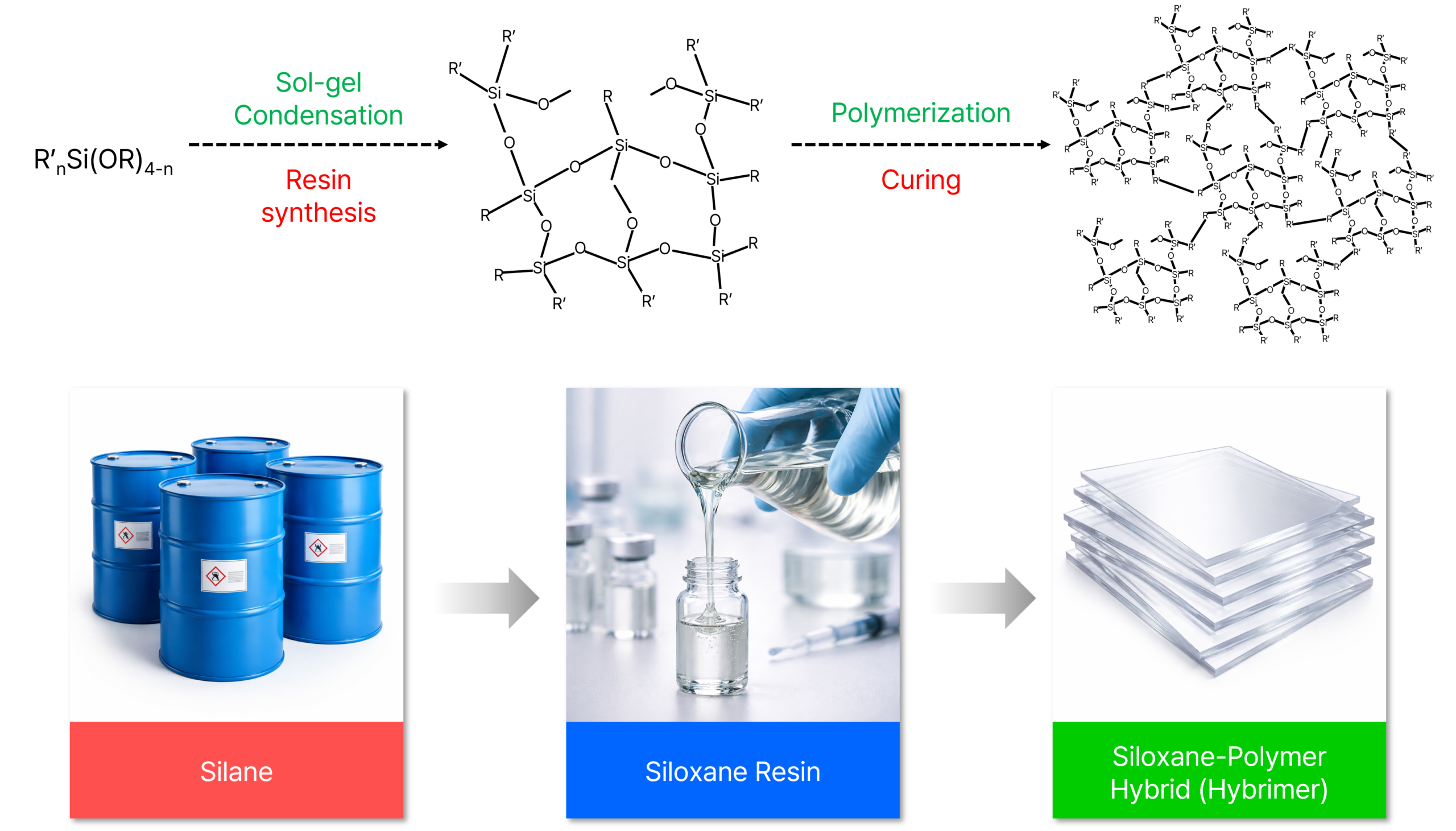 Sol-Gel siloxane hybrid material (Hybrimer) is a siloxane based organic-inorganic hybrid material that is fabricated by polymerization of sol-gel derived organo-functionalized oligosiloxane.